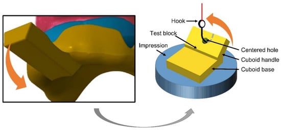 In order to measure peel-off strength between tray material and a silicone impression material, a test block was designed in a CAD software (OpenSCAD, 2015.03-2 Windows, http://www.openscad.org/). The geometrical shape of the test block was modified from that in published literature [] to simulate the peel-off action of the custom tray: A cuboid base was designed with a dimension of 25.4 mm × 25.4 mm × 6 mm, and a cuboid handle was added onto its top at an angle of 45 degrees with a centered hole (Figure 1).