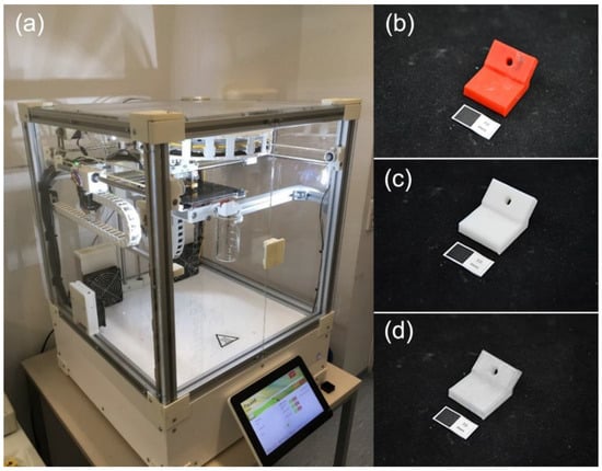 Additive manufacturing of test blocks. (a) RepRap Industrial fused deposition modeling (FDM) 3D-printer; (b) Test block printed with ABS; (c) Test block printed with HIPS; (d) Test block printed with PETG (white scale: 10 mm).