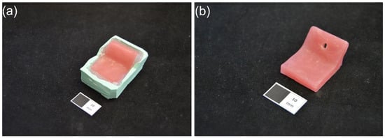 Fabrication of reference test blocks. (a) The silicone impression (green) and light-curing resin (red), (b) Reference test block (white scale: 10 mm).