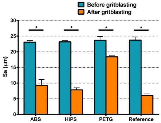 The results of two-way ANOVA of Sa indicate that the type of material, GB, and their interactions had significant effects on the Sa value (Table S1). The change in Sa shows a similar trend as the result of 3D surface reconstruction (Figure 7): Before GB, there was no statistical difference among the four groups. After GB, the Sa value of each group was significantly lower than that before GB. As shown in Table 2, the Sa value of the gritblasted PETG group was significantly higher than that of the other three gritblasted groups, followed by the ABS and HIPS groups, which did not significantly differ. After GB, the reference group had the lowest Sa value, which differed statistically from the ABS group, but not from the HIPS group.