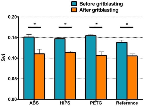 However, two-way ANOVA of Svi shows different results (Table S2): Only GB demonstrated significant effects on Svi, whereas the type of material and their interactions had no significant effects. As Figure 8 indicates, after GB, the Svi value of each group became lower, but no statistical difference could be found among the four gritblasted groups. As shown in Table 3, before GB, slight statistical differences could be found between the PETG and reference group, but the mean Svi values of all four groups were very close to each other.