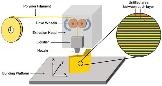 The working principle of the FDM technique. During the layered manufacturing process of FDM, the unfilled area can be found between each deposited layer, resulting in the original roughness on the FDM-printed surface.