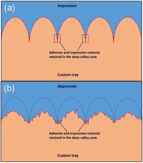 - Abdullah, M.A.; Talic, Y.F. The effect of custom tray material type and fabrication technique on tensile bond strength of impression material adhesive systems. J. Oral Rehabil. 2003, 30, 312–317. [Google Scholar] [CrossRef] [PubMed]