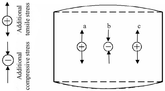 As the transversal thickness of metal plate is unevenly thinned due to the roll gap, so the transversal bending is similar to roll gap shape; because of the varied thickness reduction, the longitude elongation is varied along the transversal direction, the part with a large longitudinal elongation is restrained by the adjacent part with a small elongation, additional compressive stress is obtained (b in Figure 2); while the part with a small longitudinal elongation is stretched by the adjacent part with a large elongation, additional tensile stress is obtained (a and c in Figure 2). As a result, the longitude bending of forming convex surface part is achieved.