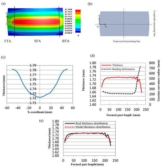 The formed part with (a) plastic strain distribution, (b) measuring lines in the middle of formed part, (c) transversal thickness distribution, (d) the local bending deformation and longitude thickness distribution, (e) and real thickness distribution and model thickness distribution.