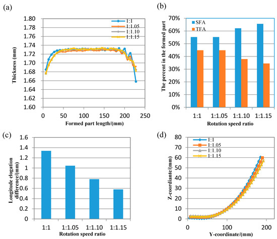 The formed part with different rotation speed ratio (a) thickness distribution (b) the percent of effective area (c) longitude elongation difference between two surfaces (d) longitude bending deformation.