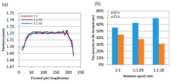 The formed part with different rotation speed ratio (a) thickness distribution (b) the percent of effective area.