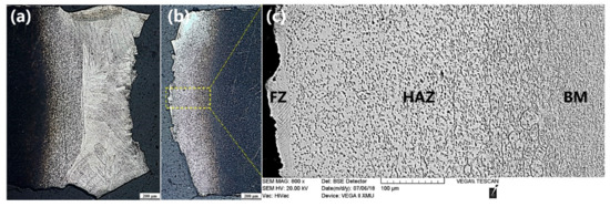- Shao, C.D.; Lu, F.G.; Cui, H.C.; Li, Z.G. Characterization of high-gradient welded microstructure and its failure mode in fatigue test. Int. J. Fatigue 2018, 113, 1–10. [Google Scholar] [CrossRef]