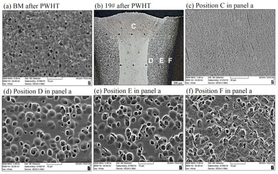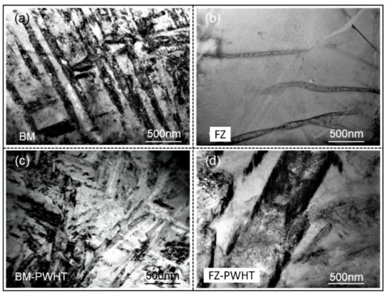 - Under the experimental conditions considered in the study, the microhardness of the BM was about 420 HV. The microhardness of the FZ in as-welded joints was in the range of 300~320 HV and increased to 390~440 HV after carrying out PWHT. Moreover, the tensile strength of as-welded joints was about 940 MPa, which took up 78.41% of that of the BM, while accounting for 96.8% after conducting PWHT.