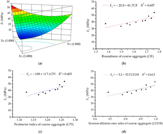 - Aggregate morphological characteristics present a positive correlation relationships modulus of immediate elasticity Burgers model (E1) and coefficient of viscosity Burgers model (η1), but a negative correlation with retardation time (τ). Therefore, aggregates with more complex morphological characteristics are conducive to improving deformation recovery and anti-deformation of asphalt mixes;