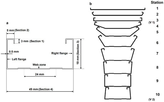 Cold roll forming, as an energy-saving and material-saving metal cold forming process, is widely used in construction, automobile, railway, aerospace, and other fields. As a kind of common metal skeleton in construction, the forming quality of C-channel steel is particularly important. However, with the shape of forming products becoming more and more complex, the requirement for forming process is becoming higher and higher. In industry production, technicians also generally design roll flowers by the trial-and-error method, which causes a large number of human and financial losses, and also makes cold roll forming process is still generally considered as art, not science [,]. Zeng et al. [,] adopted equiradial design method to build a second-order response surface model that represents the relationship between forming angle increment, roll radius, and the maximum edge membrane longitudinal strains. They also established a first-order response surface model between the above parameters and springback. By using the above methods, they optimized the roll profile and also analyzed a twelve passes roll forming process of channel section with an outer edge. Li et al. [] simulated the U-channel steel cold roll forming process with the dynamic explicit finite element method and obtained the optimized roll diameters by a response surface model. Li et al. [] analyzed the strip crossing former frame to next one and found that the concentration district of stress exits in transition region and main deforming region below the roll gap central line. Xu and Wang [] using Prandtl-Reuss flow rule and Mises yield criterion and Updated-Lagrangian increment repeatedly method to study the metal flow ruler from unsteady to steady. Zheng [] simulated the springback in cold roll forming and found that the mechanical properties of material, sheet thickness, forming angle and roll distance have effects on springback, and the springback law could not be calculated by the general springback formula. Heislitz et al. [] used PAM-STAMP (a kind of simulation software) to simulate the cold roll forming process. They adopted eight-node solid elements to generate mesh for long sheet and four-node shell elements to simulate roll surface. The results show that the strain distribution after springback can be obtained by PAM-STAMP. Sukmoo et al. [] used the rigid-plastic finite element method to simulate the forming process, and found that the work hardening coefficient has a very important effect on the forming length, annealed sheet is easier to be formed. By studying the ICF (incremental counter forming) process, Park et al. [] found that the longitudinal strain distribution and the values could be controlled by the bending angle, which is influenced by the forming parameters. Liu et al. [] used mathematical models to analyze the distribution of bending angle and longitudinal strain in the deformation process, and the calculated results were in good agreement with the experimental data, which played a role in predicting the longitudinal strain trend in cold roll forming. Jiang et al. [] found that the number of elements and mesh affects the stability and convergence of the simulation model. Jeong et al. [] used rigid-plastic finite element method to compare two different roll forming methods, and got a more reasonable roll flower design method. Cai et al. [] determined the three-dimensional curved surface of sheet metal in continuous roll forming and found that the center line of roll gap has great influence on the forming axis and longitudinal curvature.