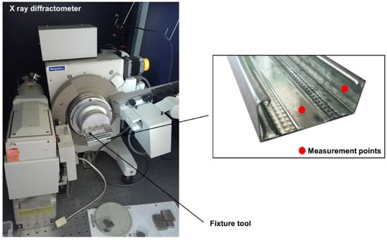 In this paper, residual stress is adopted as an index to test the forming quality of C-channel steel. Residual stresses are mainly divided into macro residual stress, micro residual stress, and the third kind of internal stress. The macro residual stress is measured in this paper. The residual stress is measured by X-ray diffractometer see Figure 3. Rigaku D/max-2500PC (Ningbo, China) is the X-ray diffraction device that we used to measure the residual stress. The power of the X-ray generator is 18 Kw. The measurement range of 2θ is −10°–158° and the parameters are shown in Table 3. Considering the work of Sánchez Egea et al. [], a Cu radiation was used. The residual stress was measured with the angle from 81.5°–84°with step size of 0.1° and measuring time of 5 s per step. According to GB/T 7704-2008 [], the measuring principle is shown in Figure 4.
