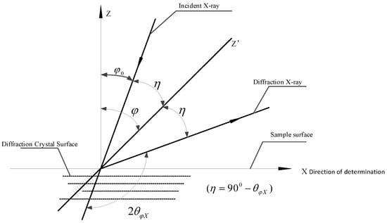where is the residual stress in X direction, while K is a stress constant, E represents the Young’s modulus, v is the Poisson ratio, denotes the bragg angle at unstressed state, and M is the slope of line . Where represents the azimuth angle of diffraction crystal plane, and is the diffraction angle for selected .