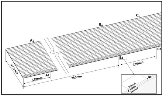 The sheet metal model is marked, as shown in Figure 5, and the front part nodes A1, A2, and the back part nodes C1, C2 are taken as the measuring nodes. As we can see from B2, the sheet mesh in thickness direction is divided into three layers and the local grid refinement is used for a better forming effect of Section 1. Figure 6a,b show that the maximum peak strain (i.e., the bending area between the web zone and the flange) in the front part of the sheet is smaller than that in the back part, and the stress distribution in the front part is also smaller than that in the back part. The main reason is the work hardening in cold forming of the sheet metal. The sheet has undergone cyclic loading and unloading. Because of the deformation of the front part, the deformation of the back part tends to the shape of the roll before it enters the roll, and the deformation of the deformed back part occurs when it contacts the roll. At this time, the deformation of the sheet metal will be more difficult to form due to the material work hardening, so the required stress is also greater than that of the front part (see Figure 6b). As a result, the forming of the back part is more thorough, the thinning is larger, and the peak strain is relatively larger.