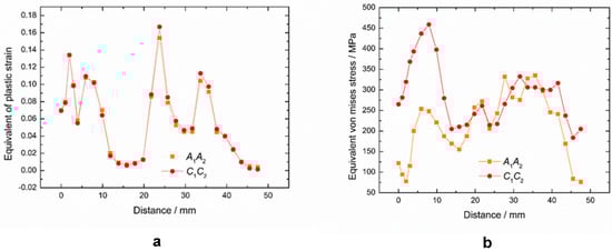 (a) Equivalent strain distribution and strain comparison; (b) Equivalent stress distribution and stress comparison between front part to behind part of the strip.