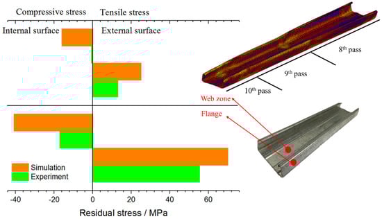 The measurement of residual stress mainly concentrates on the internal and external surfaces of web zone and flange. Figure 8 shows the experimental and numerical results of the residual stress on the internal and external surfaces corresponding to the measurement points shown in Figure 8. The simulation results have a certain error when compared with the experimental results. It can be seen that the residual stress in the web zone is significantly less than the flange, and the residual stress on the external surface is slightly larger than the internal surface. The comparison between the simulation model and the experimental samples can further prove the reliability of the simulation model, so the model can be used to predict the residual stress. The reasons for the errors are as follows, for simulation errors: (i) The mesh size of the sheet, especially at the bending zone. More layers and smaller size of the elements are needed to improve the simulation results. (ii) The assumed friction coefficient might not proper. A more accurate friction coefficient is needed. For measurement errors: (i) Q235 is used as material parameters in the simulation model, but a layer of zinc is deposited on the surface of the material, which is not reflected in the simulation model. The zinc coating may interfere with the results of X-ray diffractometer measurement; (ii) there has a certain degree of residual stress release of the measurement sample that is used in experiment because of the cutting. To improve the measurement results, the sample can be measured by mechanical measurement method, such as the hole-drilling method. However, it is a kind of destructive measurement method.