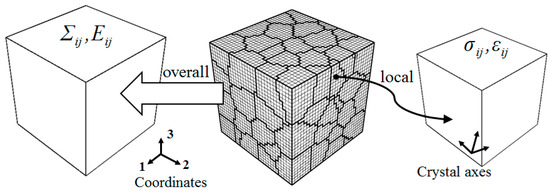 The macroscopic Cauchy stress tensor and logarithmic strain tensor are defined as the mean of the local Cauchy stresses and logarithmic strains over the RVE and calculated as load per unit area and displacements of the surfaces. Crystal plasticity is employed as a constitutive relation between local Cauchy stresses and logarithmic strains within each grain.