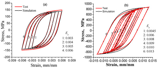 Results for steady and symmetric tensile-compressive hysteresis loops from simulations and experiments: (a) for copper T2; (b) for superalloy GH4169.