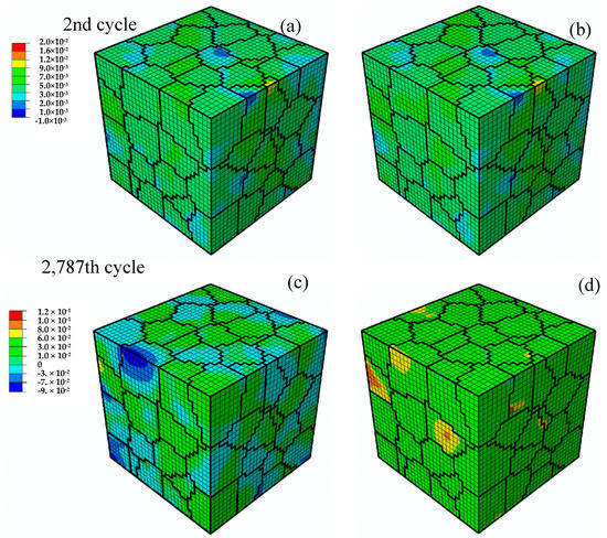 If the factors characterizing the polycrystalline structure—namely, grain orientation and anisotropy properties—are considered in the model, the deformation of the material is not uniform, even under uniform macroscopic loading. Figure 3 displays the contours of the local longitudinal strain, , i.e., the normal strain along macroscopic loading direction, and the local first principal strain, , at the second and 2787th tensile peak for a strain amplitude = 0.004. It can be seen from Figure 3a,c that the distribution of the longitudinal strains at the 2787th cycle is much more uneven than that at the second cycle, which implies that the difference of maximum and minimum values in the RVE has become much larger. The same holds for the first principal strain, see Figure 3b,d.