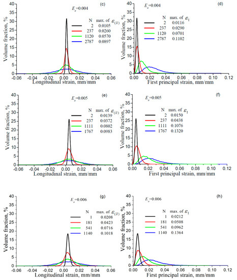 It needs to be pointed out that the strain contours are differently scaled and the plots cannot clearly visualize the changes from the 2nd to 2787th cycle. A quantitative evaluation of the strain distribution in the RVE and its change with cyclic loading is presented in Figure 4, showing the volume fractions of both the longitudinal strain and the first principal strain at the respective tensile peaks for increasing numbers of cycles number for different strain amplitudes ( = 0.003, 0.004, 0.005 and 0.006). The variation of strains in the RVE becomes larger and larger and the non-zero range expands with increasing number of cycles.