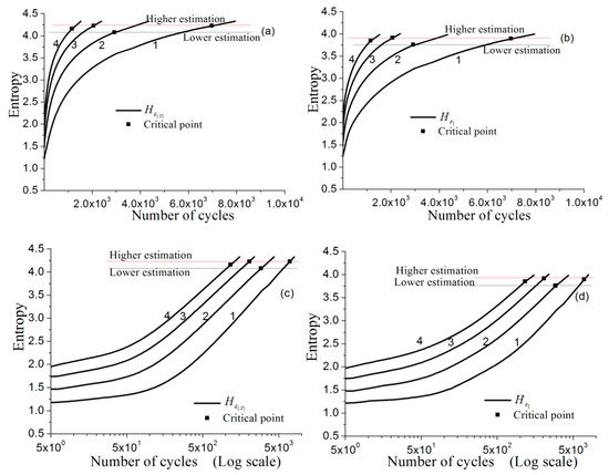 By applying Equation (12), we calculate and plot the entropy curves, and , as shown in Figure 5. The horizontal axes are linearly scaled in Figure 5a,b, and logarithmically scaled in Figure 5c,d. The information entropies of longitudinal strain and the first principal strain distributions always increase with the number of cycles. The greater the strain amplitude, the faster the entropy values increase. On the logarithmically scaled x-axes, the H(N) curves tend to become straight with similar asymptotic slopes for high numbers of cycles.