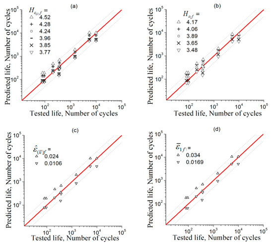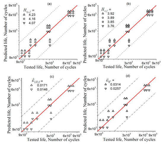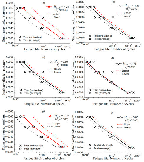 Predicted fatigue-life curves with the upper and lower estimations based on: (a–d) and (b–h) . The test data in this figure are cited from literature [53] (see Table 7).