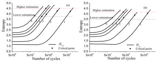 The critical entropy values resulting from and , is the fatigue-life cycle number at the specific strain amplitude , and can be determined from Figure 5. For the respective strain amplitude, the average measured critical values with respect to (see Table 7 column 3) and the upper and lower values with respect to corresponding (see Table 7 column 2), obtained from the curves, are listed in Table 7 columns 4 and 5. To prove their rationality, we need to verify whether the critical entropy value determined at any strain amplitude can be used to reasonably predict the fatigue failure at another strain amplitude.