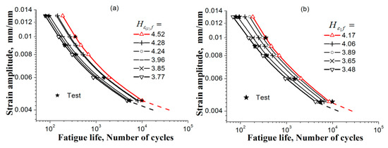 The curves and for each specified strain amplitude are shown in Figure 8a,b; the critical values of the FIPs and can be picked from each curve by specifying the average of the specific measurement of the fatigue life, these data are listed in Table 9. Then the fatigue lives at different strain amplitudes can be obtained by using any one of these critical values, further drawing a transverse line intersecting with the curves or . In addition, abscissa of intersection points on different curve are then taken to represent the estimated fatigue-life value (shown in Table 10) with respect to the specified strain amplitude. The predicted-life curves based on the FIPs and are separately displayed in Figure 9a,b. Due only one test for 4 of a total of 6 strain amplitudes having been performed, the upper and lower bounds for each FIP curve cannot be obtained, and the other 2 only had two tests conducted for each. However, the scattered feature of fatigue-life data can also be observed from this figure.