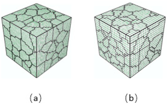 With reference to [53,54], a Voronoi polyhedron aggregation is employed as RVE. The shape, size and crystal orientation of the grains in this model are generated randomly. The plastic deformation of the grains is described by the slip driven by the resolved shear stresses acting at the respective slip systems. The RVE contains 27,000 8-node hexahedral elements and 29,791 nodes, as shown in Figure 1. It is subjected to symmetrical tensile-compressive loading cycles and its surfaces are assumed to remain plane during deformation.