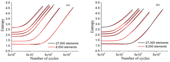 Corresponding to different strain amplitudes, the entropy curves, and , are calculated dependen on the number of load cycles based on the distribution of longitudinal strain and the distribution of the first principal strain as shown in Figure 8a,b. The horizontal axis is logarithmically scaled. Since the numbers of cycles span three powers of ten, display on a linear horizontal axis is no longer feasible. Similar to the previous analysis of pure copper, the entropy curves tend to a linear growth and the slopes are nearly equal.