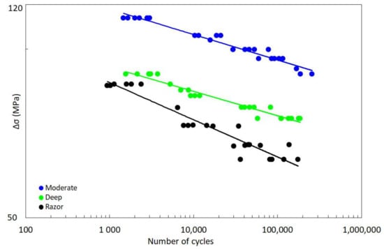 Sobieraj et al. [] aimed to determine the S-N behaviour of PEEK in the presence of stress concentrators and to estimate the duration of initiation versus propagation in a physiologically relevant environment. They preconditioned the specimens for 8 weeks and then carried out fatigue tests in a 37 °C phosphate-buffered saline (PBS) bath. Cylindrical specimens with a 8 mm outer diameter were manufactured and weakened by three different type of notches, i.e., two circumferentially U-notched specimen geometries, both with a 6 mm inner diameter, but different notch radii being 0.9 mm for the specimens labelled as moderate and 0.45 mm for those labelled as deep, and a circumferentially razor-grooved dog-bone. For more details about the specimen geometries the reader could refer to []. Tension-tension fatigue tests were carried out aiming to assess the fatigue behaviour with number of cycles to failure ranging from 1000 to 100,000 at a frequency of 2 Hz with a load ratio equal R ≤ 0.02. The fatigue data, shown in Figure 1, were fitted by Sobieraj et al. [] by means of the S-N Basquin relationship []: