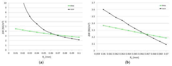 where Δσ0 is the fatigue limit of the material without geometric singularities, ΔK1A is the Notch Stress Intensity Factor (NSIF) fatigue threshold, λ1 is Williams’ eigenvalue for mode 1 [], e1 is a parameter dependent on the notch opening angle 2α, on the hypothesis considered (plane strain or plane stress) and on Poisson’s ratio ν (the reader should referred to [] for e1 formulation) and E is the Young’s modulus of the material. In plane problems the control volume becomes a circular sector or a circle, centred at the notch tip or at the crack tip depending on whether sharp V-notches or cracks are considered. For a blunt V-notch or a U-notch the circular sector is no longer centred at the crack tip, but moved back of a quantity r0 dependent on the notch opening angle. For further details the reader should refer to []. Being neither NSIF fatigue threshold nor fatigue limit of the plain material available, Equations (2) and (3) cannot be applied to determine the critical SED parameters, and an alternative approach needs thus to be used. Leveraging on the possibility offered by finite element (FE) codes like Ansys® (Canonsburg, PA, USA) to easily evaluate the strain energy within the control volume, the determination of the SED critical parameters can be performed varying the value of the radius of the control volume until the SED values for two different specimen geometries at the same number of cycles are equal, corresponding to the critical SED range value for that number of cycles, as done in [,]. Circumferentially razor-grooved dog-bone and U-notched specimen with a notch root radius of 0.45 mm have been modelled in Ansys® (Canonsburg, PA, USA), and the simulations have been carried out for different values of RC, ranging from 0.01 to 0.1 mm, with a step of 0.01 mm (Figure 2a). Then, in the range between 0.06 and 0.07 mm where the difference between the SED values for the two geometries at 150,000 cycles were lower, the simulations have been repeated with a step of 0.001 mm for the critical radius until a correspondence was found, resulting in RC = 0.067 mm and ΔWC = 3.23 MJ/m3 at 150,000 cycles (Figure 2b).