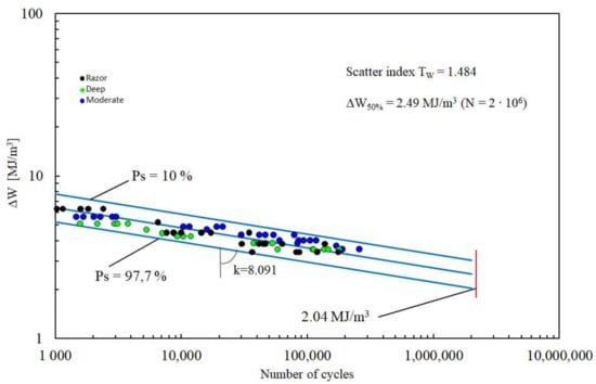 Once the critical radius was determined, the fatigue data shown in Figure 1 were analysed in terms of SED range. FE analyses were carried out considering the experimental stress range as the applied load in the simulations, determining the corresponding SED range value used to obtain the fatigue curve shown in Figure 3.