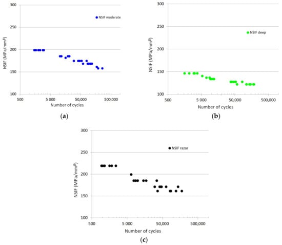 Fatigue NSIF-N curves for specimens labelled as moderate (a), deep (b) and razor (c), where β is equal to 0.5.