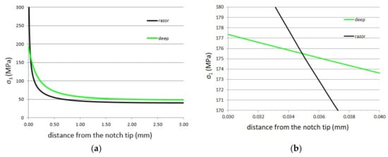 First principal stress distribution ahead of the notch tip for of “razor” and “deep” specimen (a); detail of the first principal stress distribution to determine the critical TCD parameters according to the point method, where the intersection occurs at half the value of the critical distance L (b).