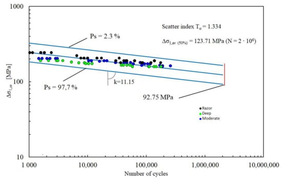 FE models were the same used for NSIF analyses. Once determined the TCD critical parameters, the fatigue data obtained in [] have been analysed by means of LM, leading to a single fatigue curve able to summarize the experimental data for all the different notch geometries (Figure 7).