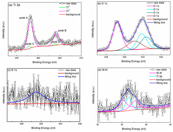 XPS spectra for (a) Ti 2p, (b) O 1s, (c) N 1s, and (d) W 4f core-level for sample 4, respectively.