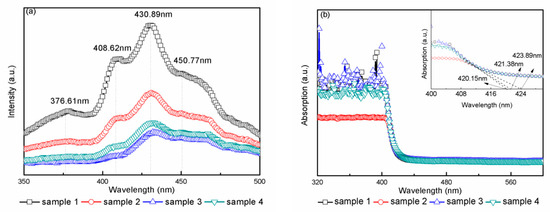 To investigate the electron–hole recombination rate and the existence of Vos, PL spectra of all samples were collected at the wavelength range of 350–500 nm and are shown in Figure 3a. In the wavelengths from 350 to 410 nm, all samples had two emission peaks, which were attributed to band edge emission. The emission peak position at 376.61 nm originated from charge recombination at the shallow-trap surface states [36]. The emission peak appearing at 408.62 nm corresponded to a band gap transition from conduction band to valence band, which was equal to the band gap of rutile TiO2 (3.02 eV). The emission peak at 430.89 nm might have been due to the self-trapped excitons in the TiO6 octahedra [37]. The emission peak at 450.77 nm and 476 nm were related to Vos in the samples due to the recombination of photogenerated holes and electrons [38,39].