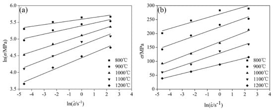 lnε versus lnσ and lnε versus σ are respectively plotted in Figure 4. The value of n1 (n1 = 6.390185) and β (β = 0.064849) could be derived from the linear fitting of versus and versus . Furthermore, the value of the α (α = 0.010148) parameter could be obtained from Equation (6).