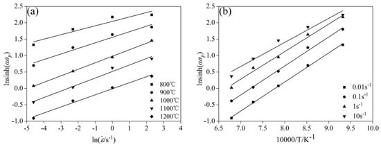 where the Zenner–Hollomon parameter (Z) is the temperature-compensated strain rate factor [19]; represents the strain rate (s−1); A denotes the structural factor, α means the stress level parameter; n is stress index; β is a constant; Q is the apparent activation energy for hot deformation (kJ/mol); R represents the gas constant (8.314 J/mol·K); and σ could be peak stress (), steady-state stress (), or flow stress corresponding to a specified strain.