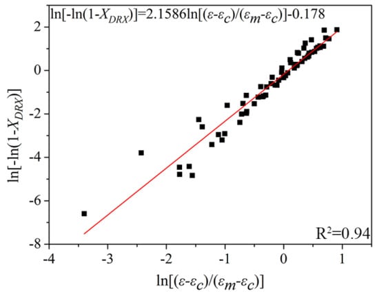 The value of k and n could be derived from linear fitting of versus (n = 2.1586, k = 0.8369). Consequently, the dynamic recrystallization kinetic model could be obtained as: