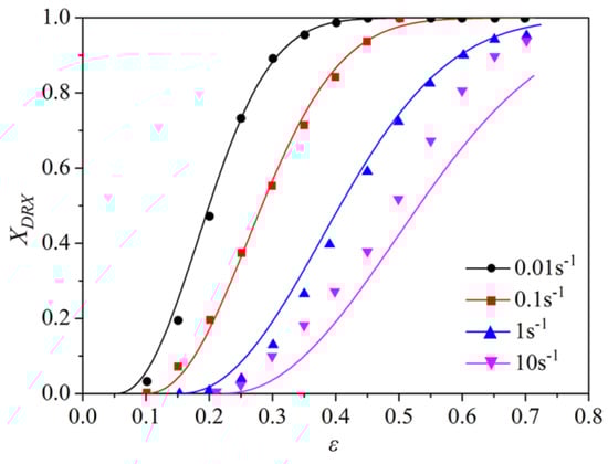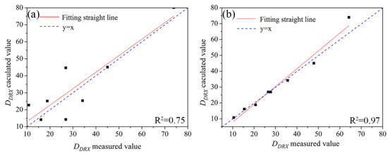The obtained linear relationship (Equation (13)) makes it possible to predict XDRX at a temperature and strain rate. Figure 8 shows a comparison of the dynamic recrystallization percentage calculated using Equation (13) and measured values. The solid line represents the calculated value and the scattered point denotes the measured values. It can be observed that the measured values are very consistent with the calculated value.