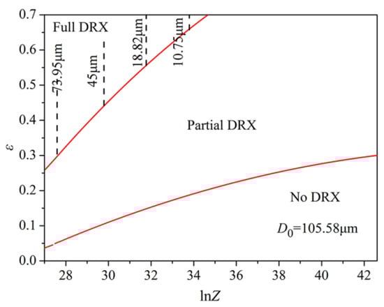 In order to reveal the relationship between deformation temperature, strain rate, strain and recrystallization percentage, and recrystallized grain size more clearly and intuitively, a dynamic recrystallization area map of the material based on the dynamic recrystallization kinetics model and the recrystallized grain size model was established. The dynamic recrystallization area map (with Z parameters and strain values as variables) is shown in Figure 10. The Z parameter, which is a function of deformation temperature and strain rate, comprehensively indicates the influence of strain rate and deformation temperature on the mechanical behavior of hot deformation. Therefore, a recrystallization area map is an important tool for developing a reasonable hot processing process in industrial production.