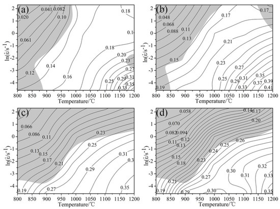 Hot processing maps of the studied steel: (a) ε = 0.1, (b) ε = 0.3, (c) ε = 0.5 and (d) ε = 0.7.