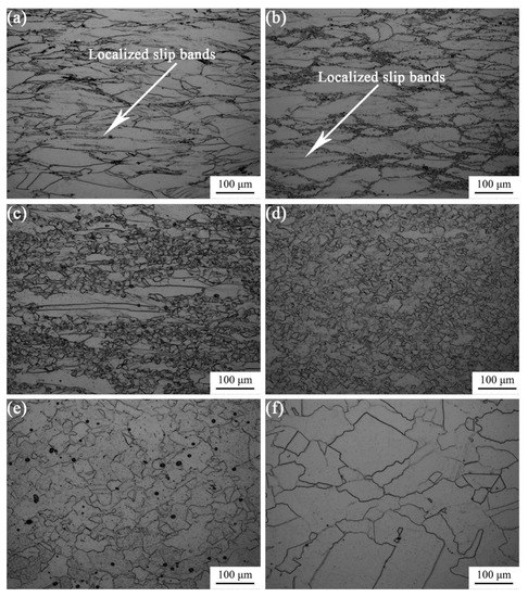 The microstructures of Fe-30Mn-0.11C steel at different deformation conditions: (a) 800 °C, 1 s−1; (b) 900 °C, 1 s−1; (c) 900 °C, 0.01 s−1; (d) 1000 °C, 0.01 s−1; (e) 1100 °C, 0.01 s−1 and (f) 1200 °C, 0.01 s−1.