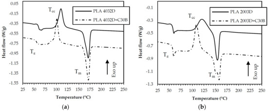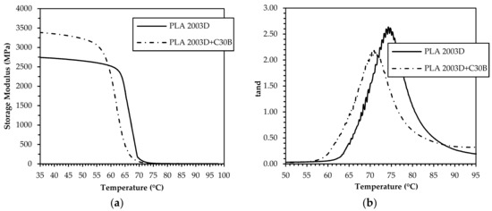Concerning the PLA 4032D-based samples, Figure 3a shows that the nanocomposite system exhibits a higher storage modulus than the neat matrix in the whole temperature range, which indicates the effectiveness of C30B nanoclay in reinforcing PLA. The difference is remarkable in the glassy state but significantly drops at approximately 60 °C, where the transition from the glassy to rubbery state occurs. Moreover, the tanδ peak (Figure 3b) of PLA 4032D+C30B is shifted towards higher temperatures and has a lower height, thus demonstrating a reduction of the polymer chains mobility as a consequence of the confinement effect caused by the nanodispersed clay. Nevertheless, in the case of PLA 2003D-based systems, even if the nanoclay addition markedly increases the storage modulus in the glassy state, the glass–rubber transition is shifted at lower temperature and thus no stiffness gain in the rubbery plateau region is achieved. This behavior may be related to the existence, in the PLA 2003D+C30B sample, of regions with different densities and higher free volume than the unfilled matrix [37,38], resulting from the presence of quite big stacks of intercalated filler and from the poor polymer chain stereoregularity. However, in this case the tanδ peak height and peak area of the nanocomposite system are lower than that of neat matrix because the elastic component increases more than the viscous component, indicating a decrease in the mobility of the polymer chains.