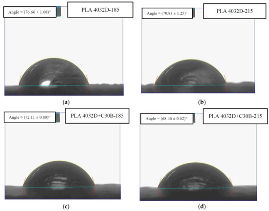Contact angle of (a) PLA 4032D-185, (b) PLA 4032D-215, (c) PLA 4032D+C30B-185, (d) PLA 4032D+C30B-215.