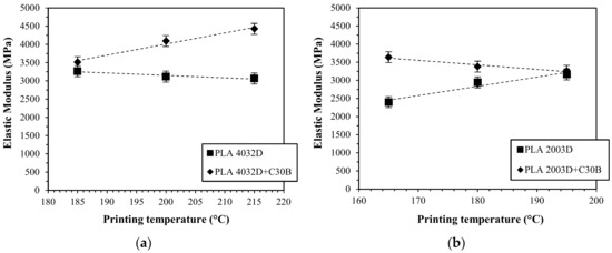 Elastic modulus of the 3D printed samples of PLA 4032D and PLA 4032D+C30B (a) and PLA 2003D and PLA 2003D+C30B (b) printed at different temperatures.