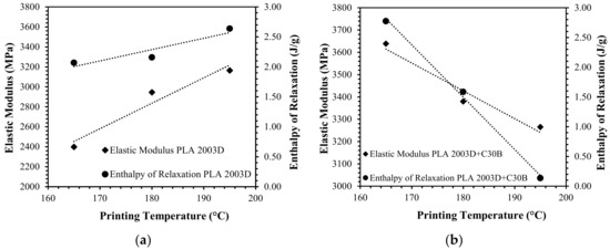 Correlation between elastic modulus and enthalpy of relaxation and 3D printing temperature for PLA 2003D (a) and PLA 2003D+C30B (b).