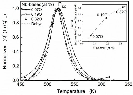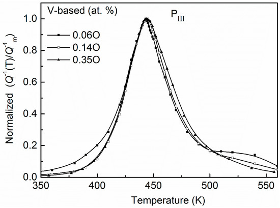 On the other hand, the relaxation characteristic of the V-based Nb–V–O system was different from the case of Nb-based alloys. For example, in V-based Nb–99.5V (at. %) alloy, only one peak (denoted PIII) occurs at about 450 K. The normalized relaxation peaks for Nb–99.5V (at. %) systems with different oxygen concentrations are shown in Figure 2. It can be seen that there are no significant broadening effects with the increasing of oxygen content. Since this peak temperature is close to that of the Snoek peak in vanadium as reported by various investigators, Carlson et al. interpreted it as an unperturbed V–O Snoek peak and as evidence that there is no trapping, but antitrapping, of oxygen by Nb in this V-rich alloy. However, this interpretation was controversial to the kinetic measured results of oxygen in Nb–V alloys by Park and Altstetter [17].